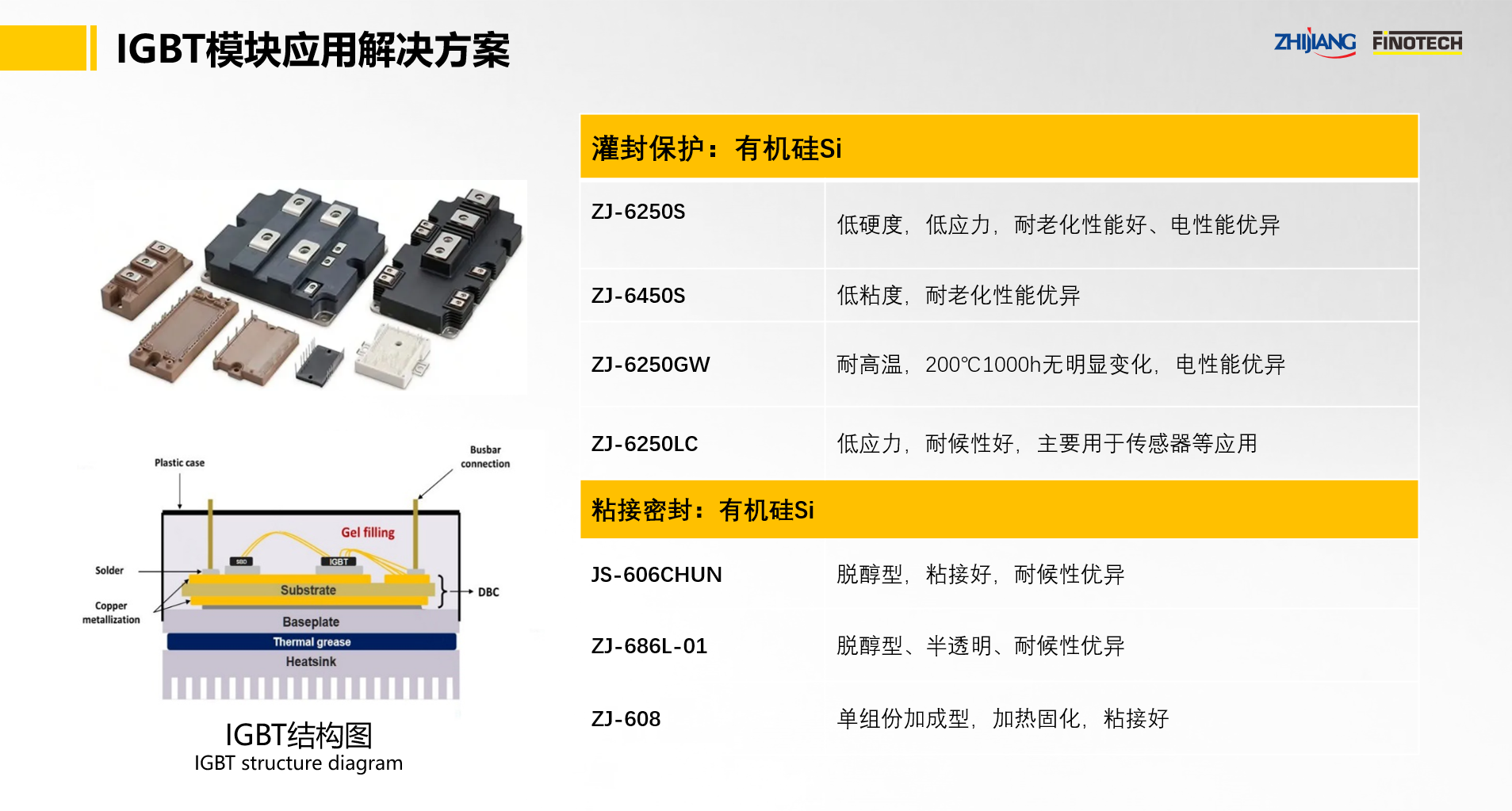 IGBT封裝材料:ZJ-6250S/6250GW、ZJ-6450、ZJ-6250H、ZJ-6250LC有機(jī)硅凝膠; IGBT粘接材料:JS-606CHUN、ZJ-686L-01、ZJ-608。
