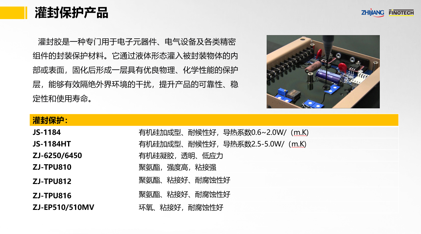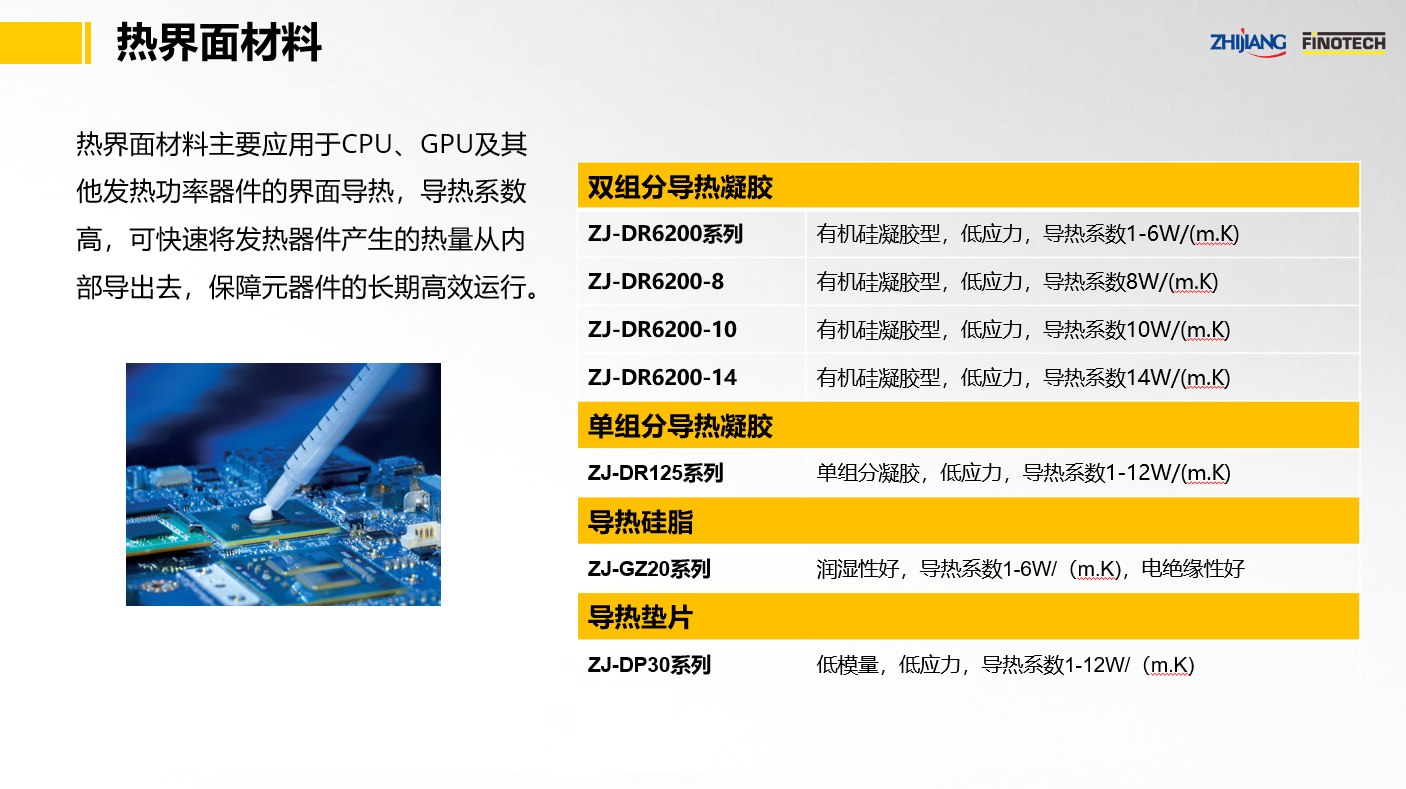 ZJ-DR6200系列(雙組分導熱硅凝膠)、ZJ-DR125系列(單組分導熱硅凝膠)ZJ-GZ20系列(導熱硅脂)、JS-1184系列(有機硅導熱灌封膠)