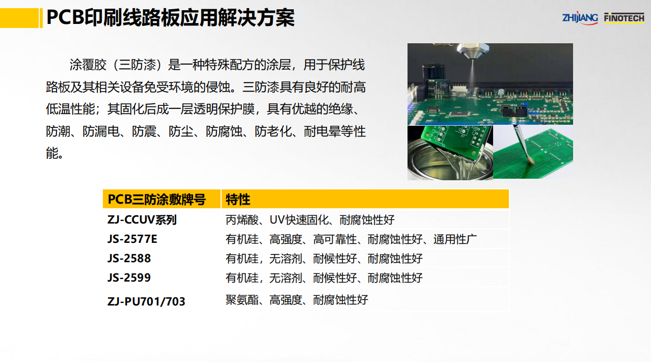 之江公司立足于中國膠粘劑行業領軍企業和有機硅、聚氨酯、環氧等專業膠粘劑的創新和產業化優勢,具有國家高新技術企業和國家級企業技術中心資質,依靠國家級CNAS實驗室以及國家級博士后科研工作站,并有國際專家助力,為PCB印刷線路板的三防涂敷、粘接固定、導熱灌封等提供系統用膠解決方案。其中,關鍵產品如下: